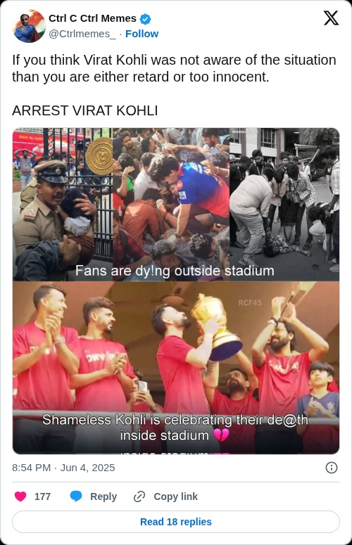 आरसीबी की जीत का जश्न बेंगलुरु में हुआ जानलेवा, 11 लोगों की मौत, 30 से अधिक घायल।